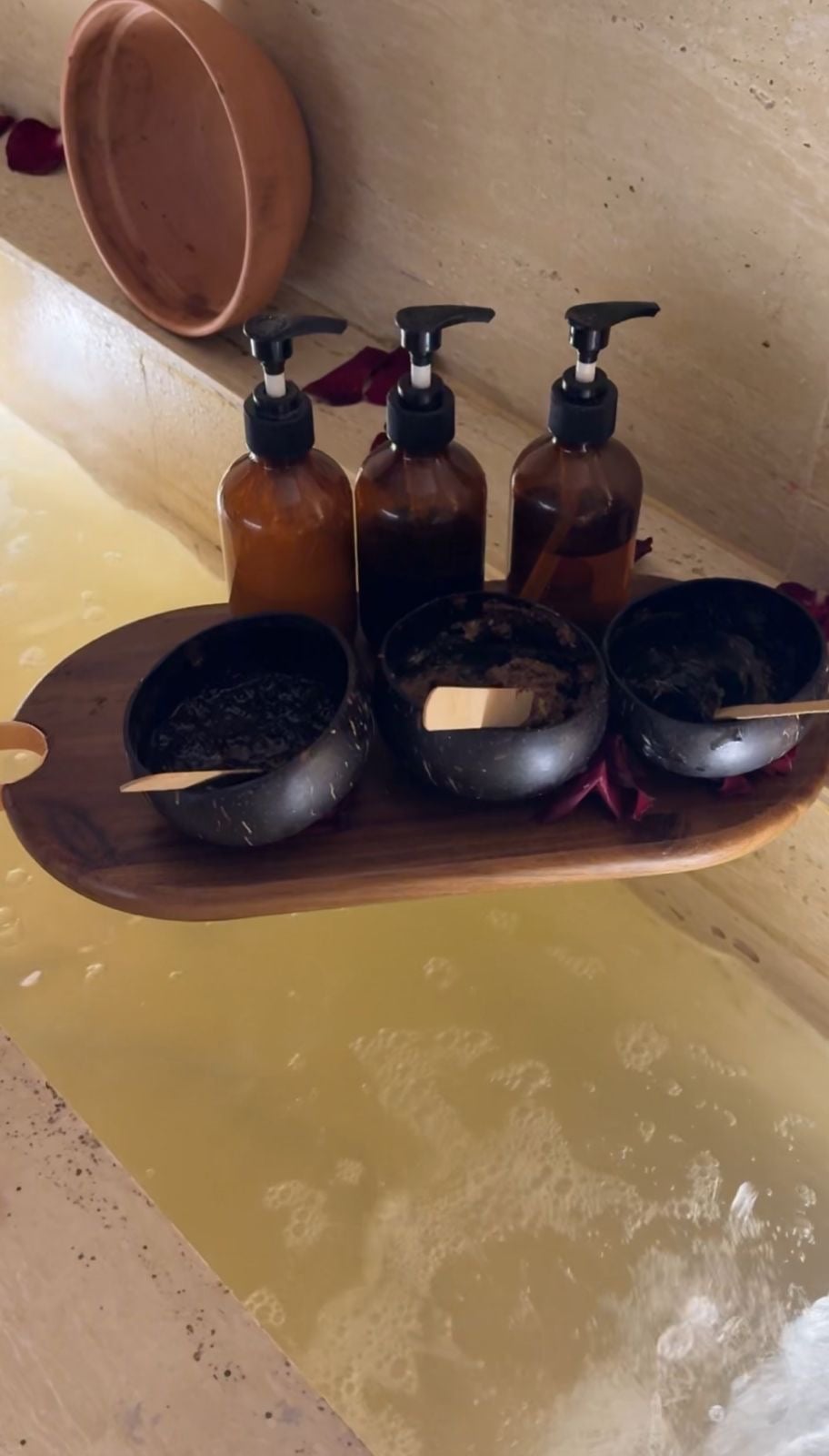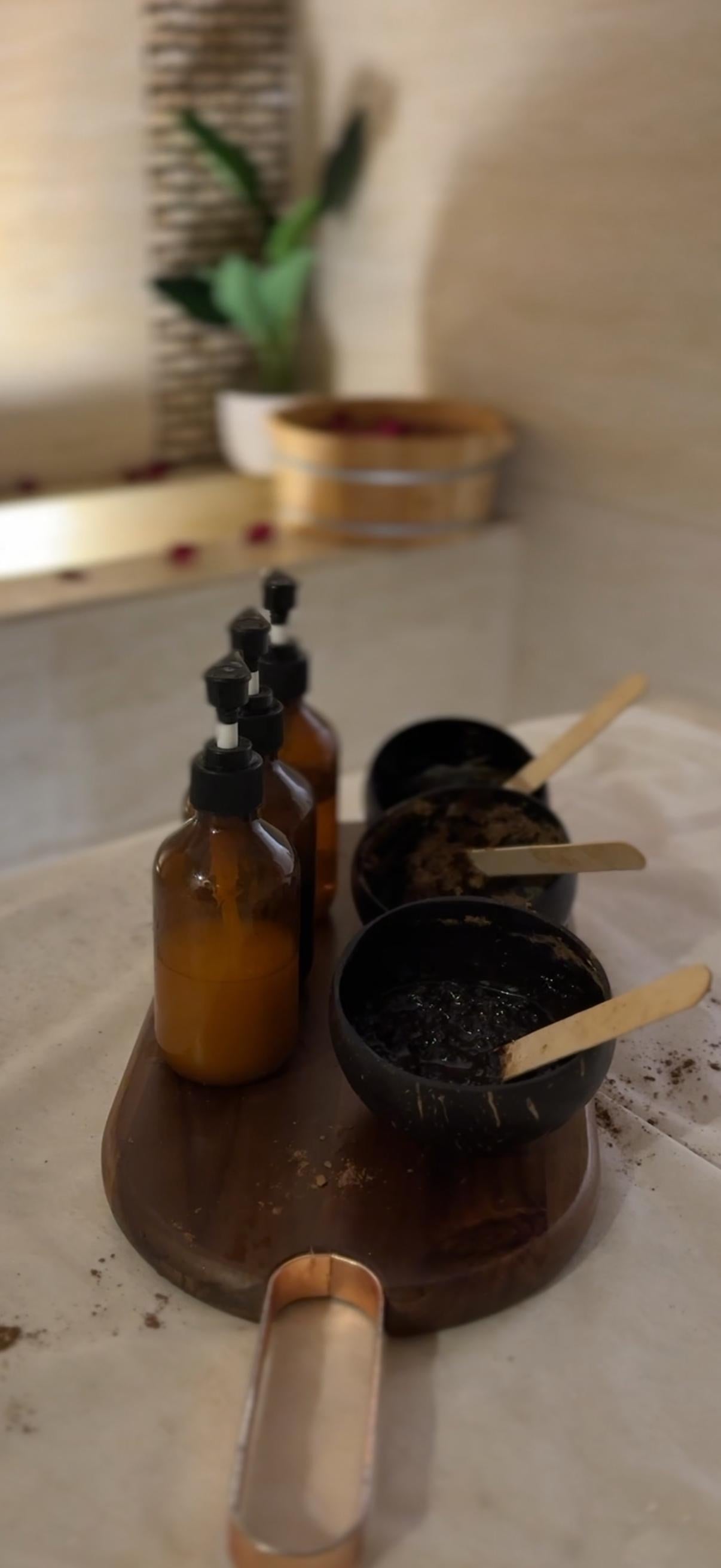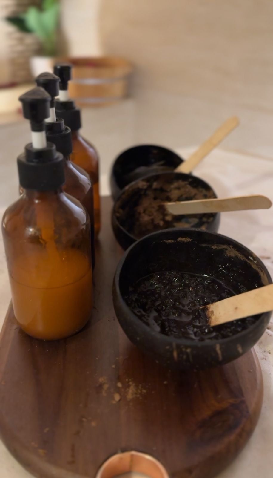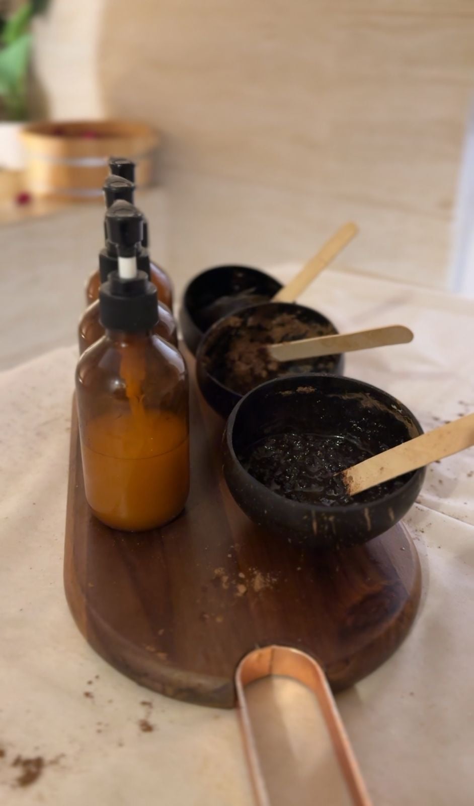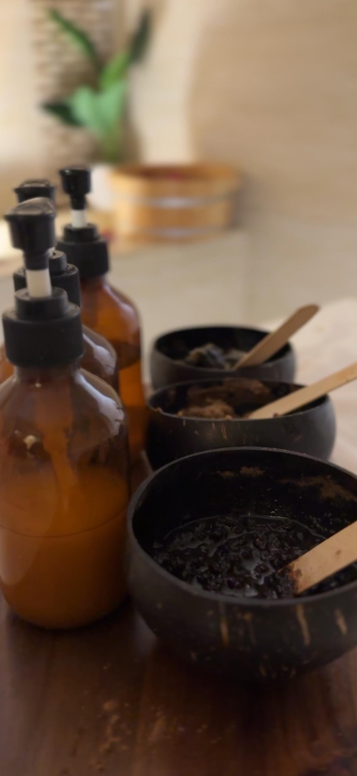 حمام مغربي بتقشير القهوة التي تساعد على تنشيط الدورة الدموية، وتنقية البشرة والتخلص من الخلايا الميتة، مع ترطيب بزيت جوز الهند.